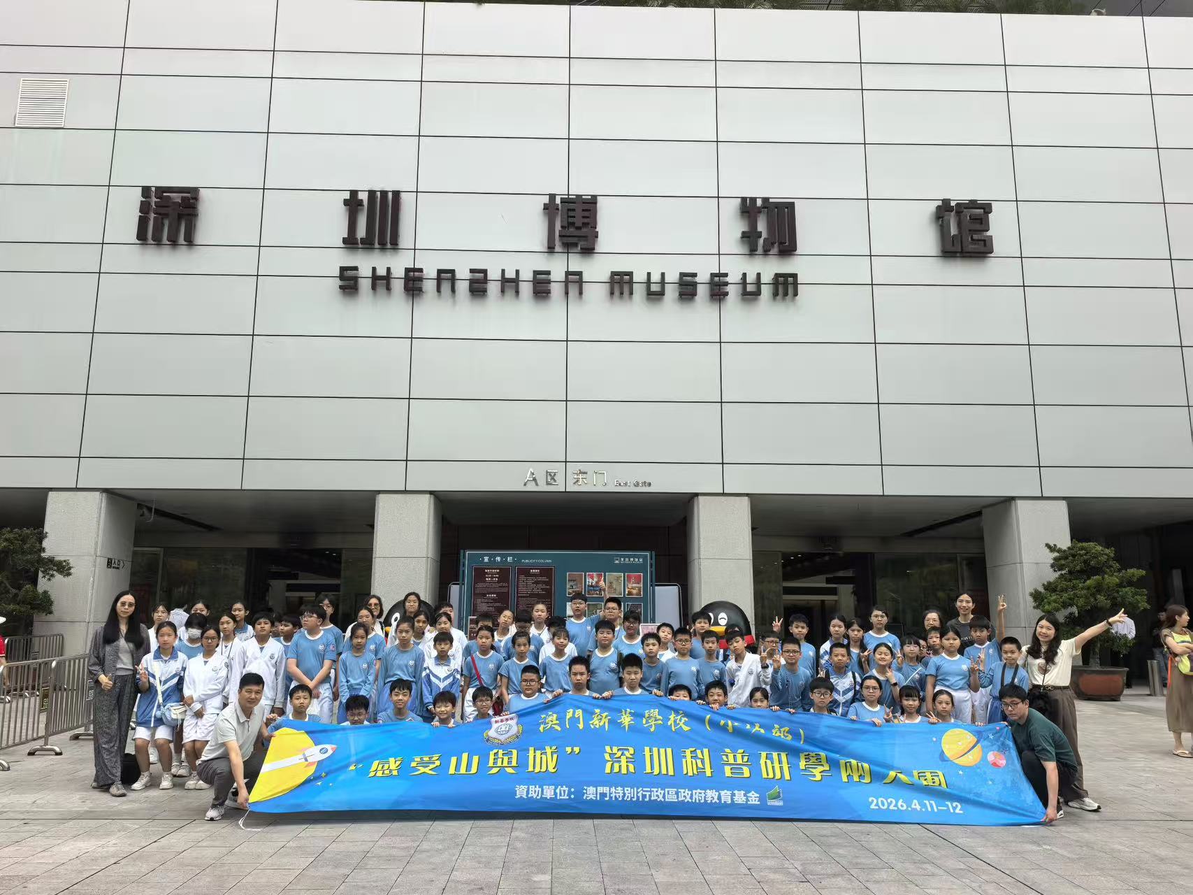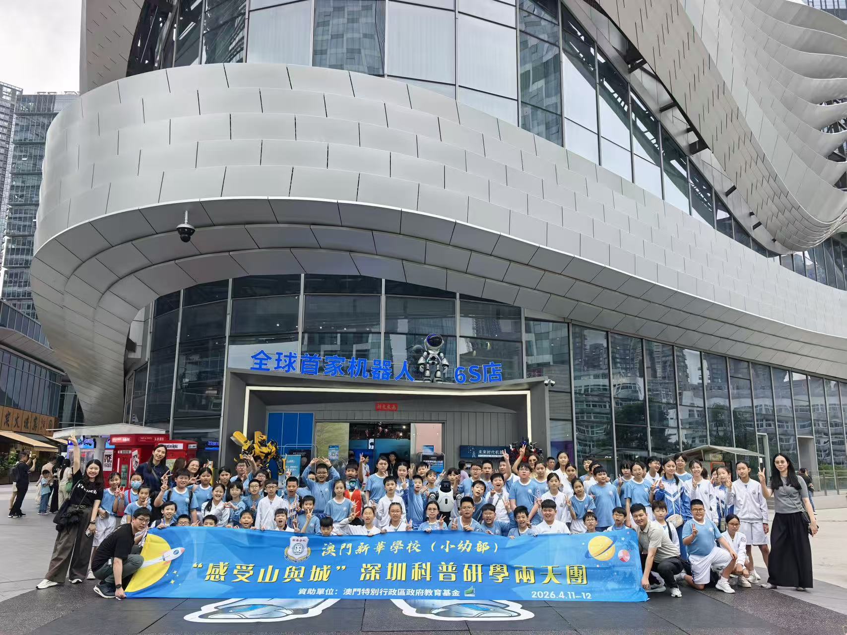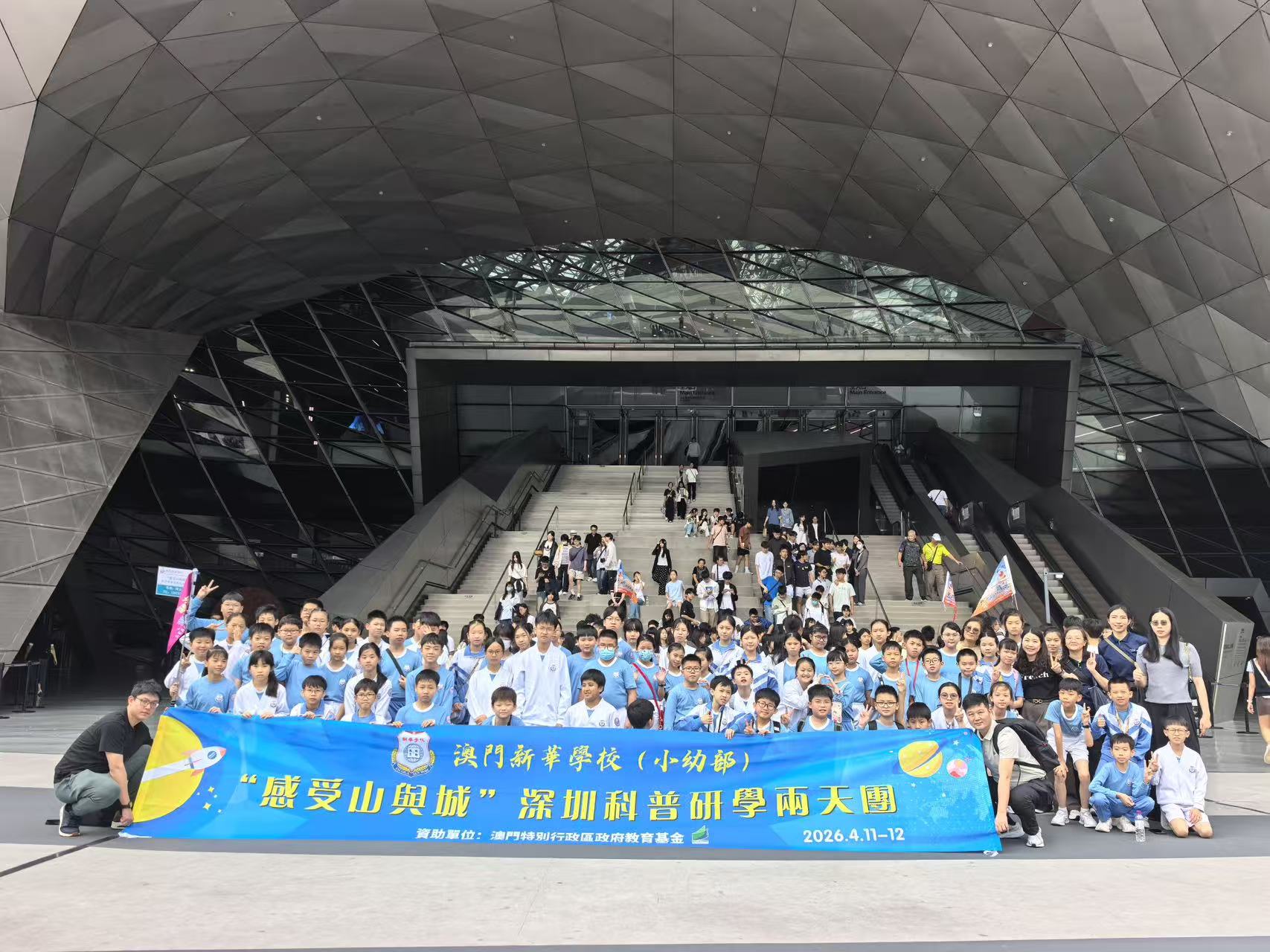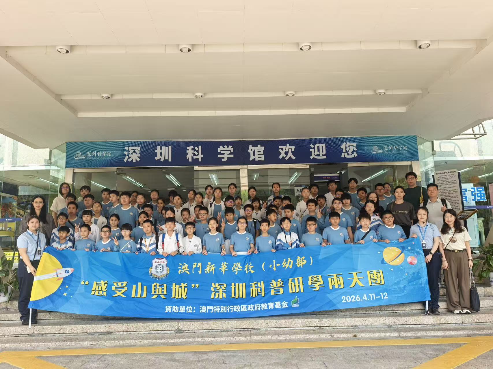 新華學校一直以科創為辦學特色,為延續「第三屆粵港澳大灣區青少年科技展」的學習成效, 2026年4月11日至12日,新華學校(小幼部)77名師生前往深圳展開兩日一夜的「感受山與城」科普研學之旅。是次活動由澳門教育及青年發展局教育基金全額資助,行程涵蓋城市規劃、人工智能、機器人科技、自然科學、歷史文化及愛國教育等範疇。